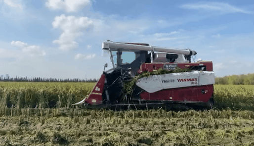 無(wú)人駕駛收割機(jī)所到之處,成熟的水稻被整齊地割斷,經(jīng)過(guò)脫粒、卸糧、裝糧,變成一堆堆金黃色的稻粒。