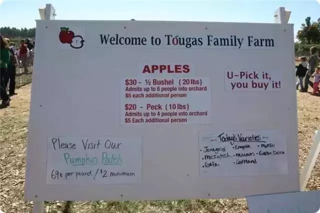 凡入園采摘者,均需要排隊購買采摘袋,小袋20美元一個,可以采摘約10磅蘋果,并最多進園4人,大袋30美元一個,可以采摘20磅蘋果,并最多可進園6人。
