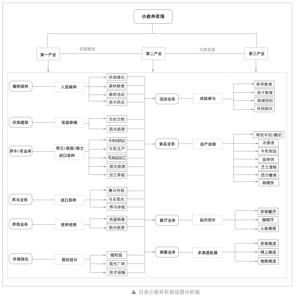 從貧瘠荒涼之地變成天高云闊,風吹草低見牛羊、綠油油的草原農場,小巖井農場的特色優勢不在豐富的資源基礎,更沒有源源不斷的客流保障,但它從地域優勢出發,以完善的產業鏈結構,多樣化的價值體現,以“逢山開路遇水填橋”的韌性,創造了日本私立農場“百年老字號”的奇跡。