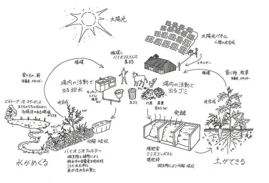 整個農場建立了可持續發展的循環結構。奶酪畜牧業場和養雞場產生的糞便、各個設施產生的生活垃圾、雜草等,在大型工廠發酵,作為堆肥在農場進行再利用,實現有機物循環。生活排水通過活用微生物和植物等自然凈化作用的被稱為“生物過濾器”的循環型過濾裝置回到自然狀態。
