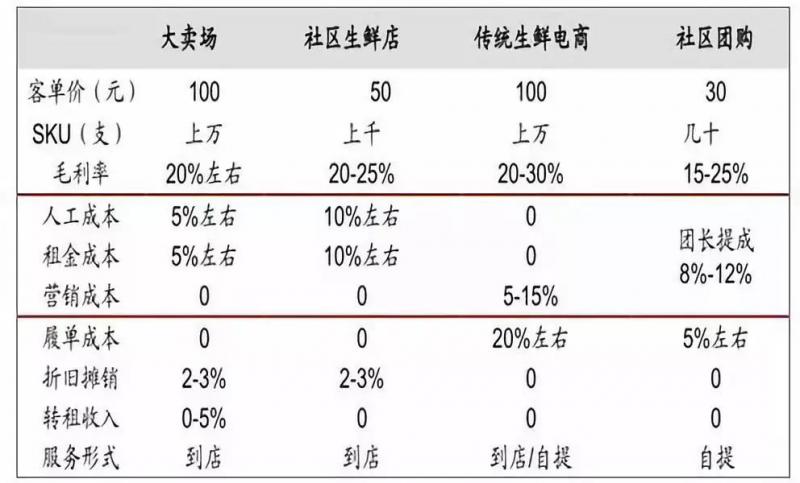 社區團購作為實體門店業態的補充,不需要設立單獨的貨物存放點,已有的倉儲可直接投入使用。社區團購所需人工成本,租金成本都比傳統行業低,進而提升利潤。(如下圖以生鮮行業為例)