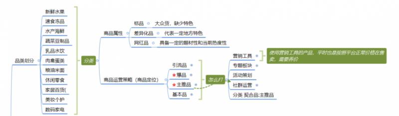 根據這些商品品類,筆者按照商品屬性以及商品運營策略進行進一步劃分,其中商品屬性比較好理解,主要根據商品的特點以及當前的熱度情況,劃分為標品、差異化品和網紅品。