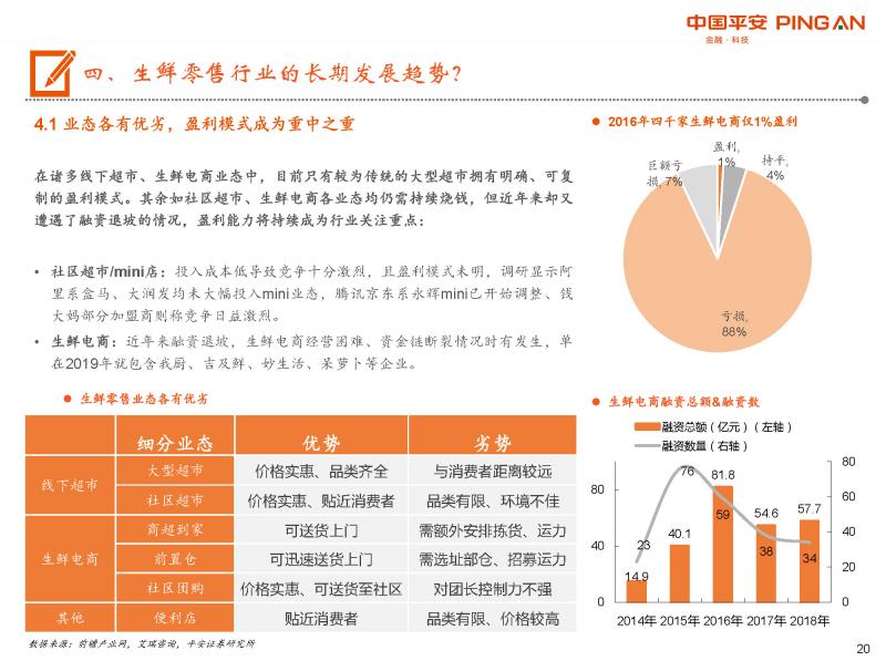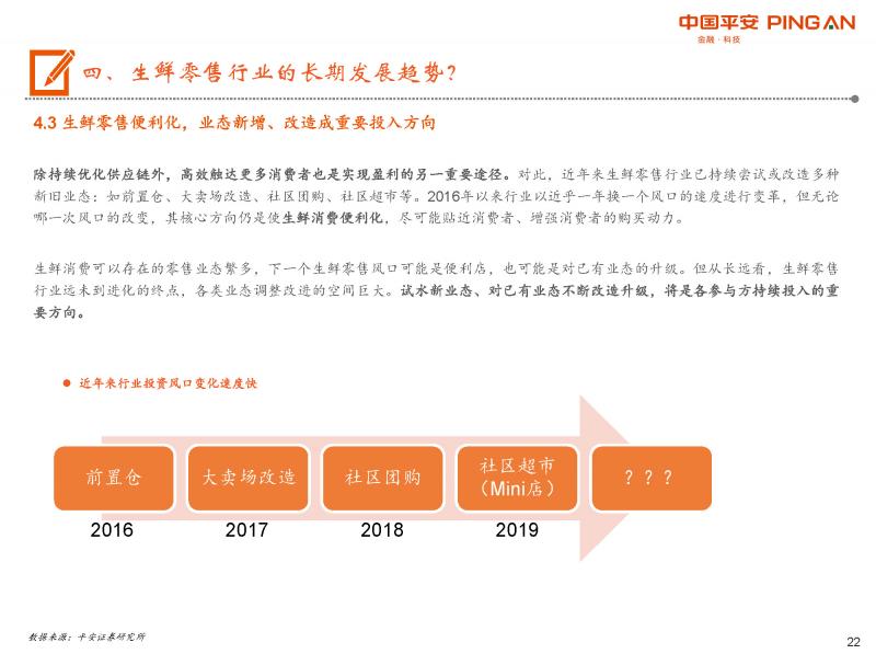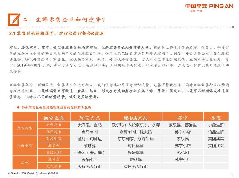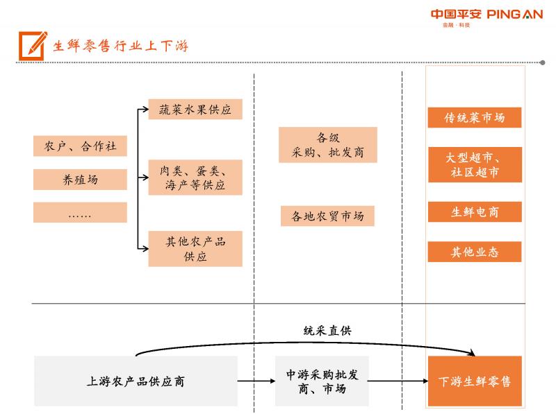 線上線下零售巨頭均在生鮮零售各領域大規模布局,行業開始劃分陣營對壘。其次,生鮮零售的盈利模型決定供應鏈&消費者觸達為競爭核心:1、企業不斷整合下游需求、往上游直采,持續優化供應鏈。2、企業嘗試同時經營多種業態,進一步貼近消費者,擴大消費群體。