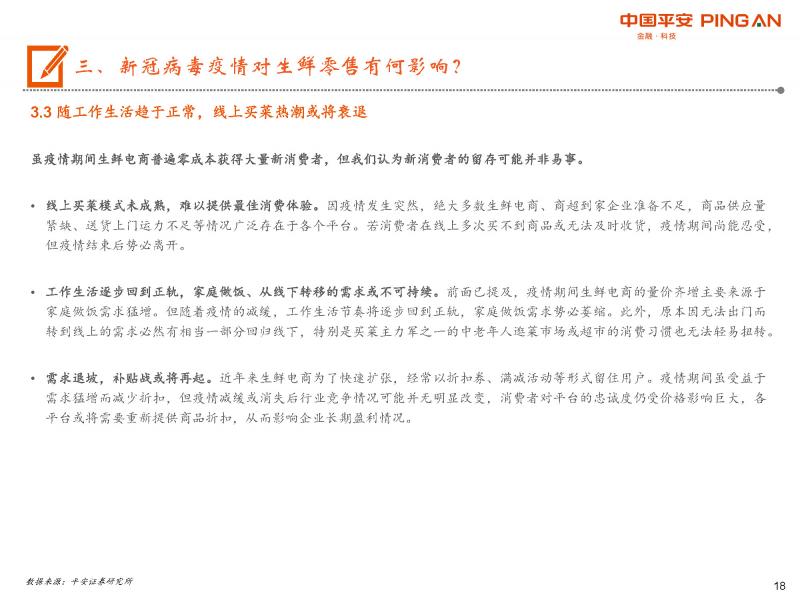 疫情導致線上買菜量價齊增,生鮮電商銷售額井噴。特別是新用戶數大幅增加、消費人群發生改變,因此本次疫情或是培養生鮮線上消費習慣的一次良機。但我們認為新消費者的留存可能并非易事:1、線上買菜模式未成熟,難以提供最佳消費體驗。2、隨著工作生活逐步回到正軌,家庭做飯、從線下轉移的需求或不可持續。3、需求退坡后補貼戰或將再起。