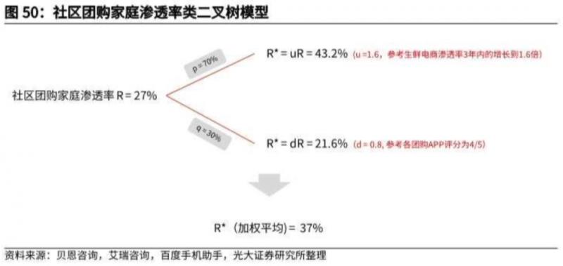 由于社區(qū)團(tuán)購模式較為初期,行業(yè)滲透率仍有一定下行風(fēng)險(xiǎn)。參考艾瑞咨詢生鮮電商到2023年的滲透率變化預(yù)測(cè)和現(xiàn)階段用戶對(duì)于社區(qū)團(tuán)購APP的反饋評(píng)分,我們通過二叉樹模型得出了參考中值約為37%。