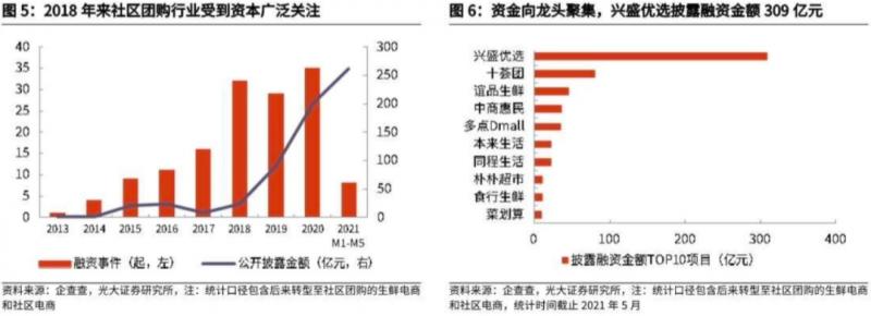 從融資角度看,2018年來社區(qū)團(tuán)購受到資本廣泛關(guān)注,資金向龍頭聚集。據(jù)企查查數(shù)據(jù),2018年社區(qū)團(tuán)購相關(guān)融資數(shù)量32起,融資金額23.5億元,融資金額同比2017年增加217%;2019年開始內(nèi)部洗牌,融資數(shù)量略有下降;2020年疫情催化劑下,社區(qū)團(tuán)購再度受到資本關(guān)注,相關(guān)融資35起,融資金額由2019年的91億元增至200.7億元,同比增加121%。融資金額向頭部聚集,截至2021年5月,興盛優(yōu)選融資金額居榜首,309億元,遠(yuǎn)多于其他參與者。