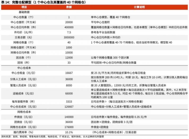 需要說明的是,團(tuán)長(zhǎng)也承擔(dān)履約責(zé)任,但由于團(tuán)長(zhǎng)傭金率可被固定,為研究履約費(fèi)用率的壓縮空間,這里履約費(fèi)用僅包含指中心倉及網(wǎng)格倉環(huán)節(jié)。
