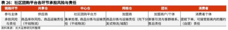 總體而言,社區(qū)團(tuán)購平臺(tái)方壓力被轉(zhuǎn)移至鏈路其他主體。但需要注意的是,由于全鏈路中外包、加盟環(huán)節(jié)多,平臺(tái)方庫存、運(yùn)輸、運(yùn)營(yíng)壓力雖減少,但人員管理、加盟商關(guān)系維系的壓力較大,如何做好全鏈路人員及合作方管理將是社區(qū)團(tuán)購業(yè)態(tài)的難點(diǎn)。