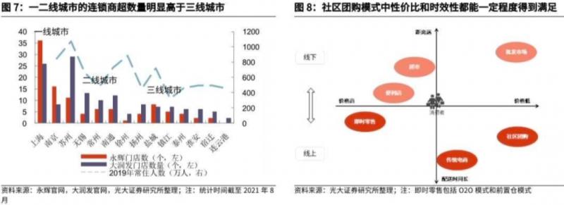 一是,彌補(bǔ)部分低線城市的線下商超空缺。以江蘇地區(qū)的大型商超(永輝和大潤(rùn)發(fā))為例,一二線城市的連鎖商超數(shù)量明顯高于三線城市;在常住人口數(shù)接近的情況下,二線城市擁有比三線城市更多的大型全國(guó)連鎖商超門店。在三線及以下城市,社區(qū)團(tuán)購可以一定程度上彌補(bǔ)線下商超的空缺。