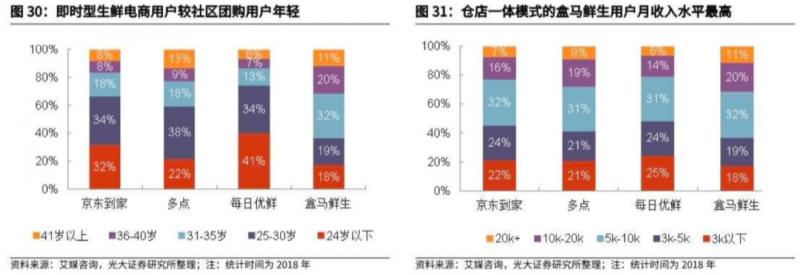 根據(jù)艾媒咨詢統(tǒng)計(jì),2018年對(duì)于京東到家、多點(diǎn)、每日優(yōu)鮮和盒馬鮮生的統(tǒng)計(jì),即時(shí)型電商(包括平臺(tái)類和自營(yíng)類)的用戶較為年輕,41歲以上的用戶僅6%~13%。前置倉模式的每日優(yōu)鮮的用戶最為年輕,24歲以下的用戶高達(dá)41%。對(duì)比社區(qū)團(tuán)購,2020年40歲以上的用戶高達(dá)38.6%,是對(duì)生鮮電商的年齡分布斷層的補(bǔ)充。此外,倉店一體模式的盒馬鮮生的用戶年齡較大,收入水平也較高。