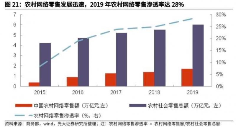 根據(jù)國(guó)家商務(wù)部2019年統(tǒng)計(jì),2019年農(nóng)村網(wǎng)絡(luò)零售額達(dá)1.7萬億元,同期農(nóng)村社會(huì)消費(fèi)品零售總額6.0萬億元,農(nóng)村網(wǎng)絡(luò)零售滲透率(農(nóng)村網(wǎng)絡(luò)零售額/農(nóng)村社會(huì)消費(fèi)品零售總額)為28%,較2015年凈增加20%。