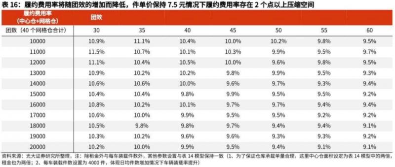 除中心倉面積為原來的2倍(防止日均單量增加而爆倉)和每車裝載件數(shù)設(shè)定為4000件(裝載率隨單量增加而提高)外。維持7.5元的件單價(jià),團(tuán)數(shù)恒定在11000個(gè)時(shí)(40×275),團(tuán)效由30增至60,履約費(fèi)用率可下降1.8%;團(tuán)效和團(tuán)數(shù)同時(shí)增加時(shí),履約費(fèi)用率最高可壓縮2個(gè)百分點(diǎn)以上。此外,件均價(jià)增加、自動(dòng)化分揀技術(shù)的使用等均可促進(jìn)履約費(fèi)用率的下降。