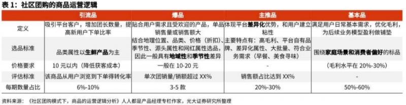 社區(qū)團(tuán)購的商品運(yùn)營(yíng)邏輯,類似于電商店鋪的運(yùn)營(yíng)邏輯:通過引流品吸引新用戶,爆品刺激用戶下單;再根據(jù)主推品樹立平臺(tái)形象,以基本品優(yōu)化毛利,為后續(xù)盈利做鋪墊。現(xiàn)階段,社區(qū)團(tuán)購的商品依然處于以 “引流品”和“爆品”引流的初級(jí)階段。