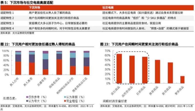 一是,熟人社交購物適配團(tuán)長(zhǎng)模式;二是,關(guān)注流行/低價(jià)商品適配少SKU多爆品的商品結(jié)構(gòu);三是,家庭大多以孩子為中心適配商品以廚房食材為主的特點(diǎn);四是,閑暇時(shí)間較多適配“預(yù)售+自提”模式。