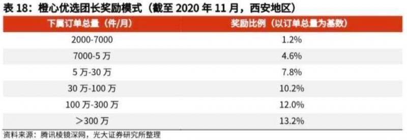 以美團(tuán)優(yōu)選為例,當(dāng)團(tuán)長(zhǎng)直屬下級(jí)團(tuán)長(zhǎng)小于等于3個(gè)時(shí),可獲得培訓(xùn)費(fèi)(新開團(tuán)下級(jí)7天銷售額大于1000元,可獲得培訓(xùn)獎(jiǎng)勵(lì)100元,大于5000元?jiǎng)t追加獎(jiǎng)勵(lì)60元);當(dāng)團(tuán)長(zhǎng)直屬下級(jí)團(tuán)長(zhǎng)大于3個(gè)時(shí),可獲得培訓(xùn)費(fèi)(規(guī)則同前)和下級(jí)團(tuán)長(zhǎng)銷售提成(直屬下級(jí)團(tuán)長(zhǎng)銷售件數(shù)的12%和隔級(jí)下級(jí)團(tuán)長(zhǎng)銷售件數(shù)的3.6%)。橙心優(yōu)選“合伙人制度”同理,以當(dāng)月直推團(tuán)長(zhǎng)和直推合伙人的訂單總量作為獎(jiǎng)勵(lì)基礎(chǔ)。