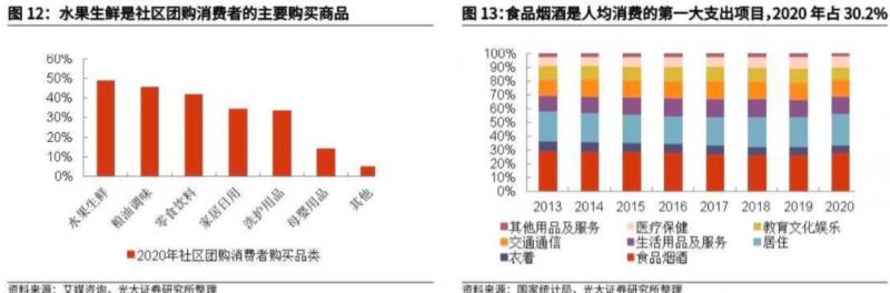 從商品結(jié)構(gòu)看,社區(qū)團(tuán)購現(xiàn)階段主要聚焦家庭廚房,主要包括食品類(以生鮮食材為主)和日用百貨類。2020年,食品煙酒類支出仍然是中國(guó)居民的第一大支出,占人均總消費(fèi)支出30.2%;2020年日用百貨類消費(fèi)支出占人均總消費(fèi)支出5.9%。