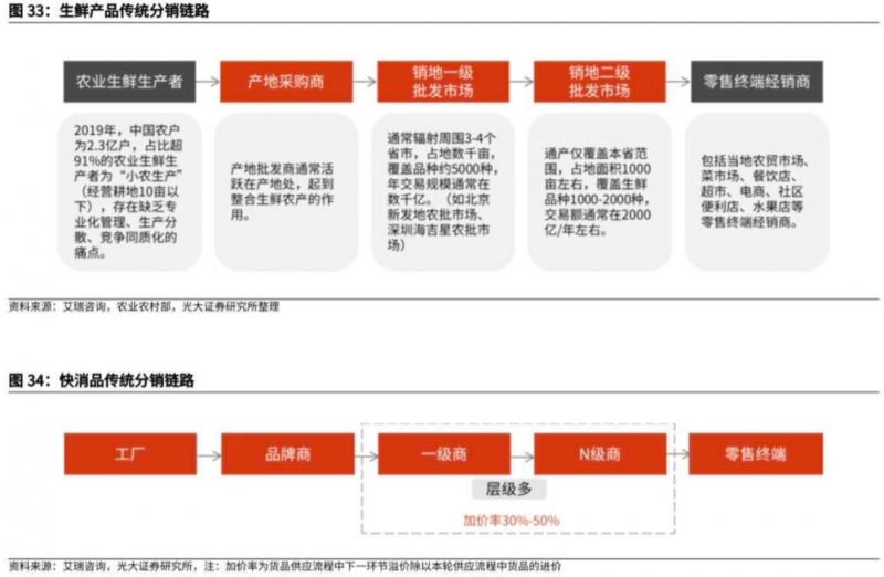 1)生鮮、快消品傳統(tǒng)分銷鏈路環(huán)節(jié)眾多。