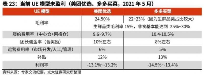 隨著2020年7月美團(tuán)、拼多多、滴滴等互聯(lián)巨頭入場(chǎng)并投入補(bǔ)貼、快速地推,興盛優(yōu)選UE受到影響,履約費(fèi)用率升至5%-6%。2021年5月大型平臺(tái)如美團(tuán)優(yōu)選、多多買菜等,履約費(fèi)用率在10%左右,加之團(tuán)長(zhǎng)傭金(8%-10%)、補(bǔ)貼(12%-13%)和運(yùn)營(yíng)費(fèi)用(5%-6%),普遍具有10%以上虧損。