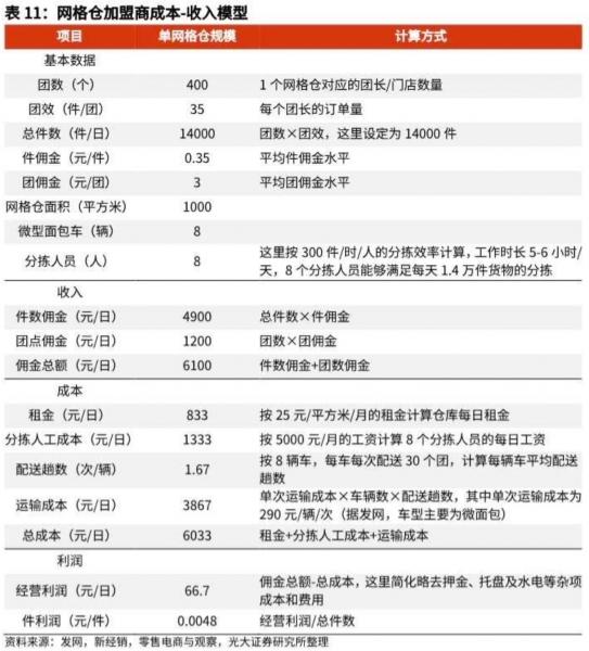 3)利潤(rùn)端,不計(jì)押金、托盤、水電等雜項(xiàng),1000平米的單網(wǎng)格倉營(yíng)業(yè)利潤(rùn)在日均件數(shù)14000件,團(tuán)效35件/團(tuán),團(tuán)點(diǎn)400個(gè)的規(guī)模下,單日經(jīng)營(yíng)利潤(rùn)66.7元,基本盈虧平衡;