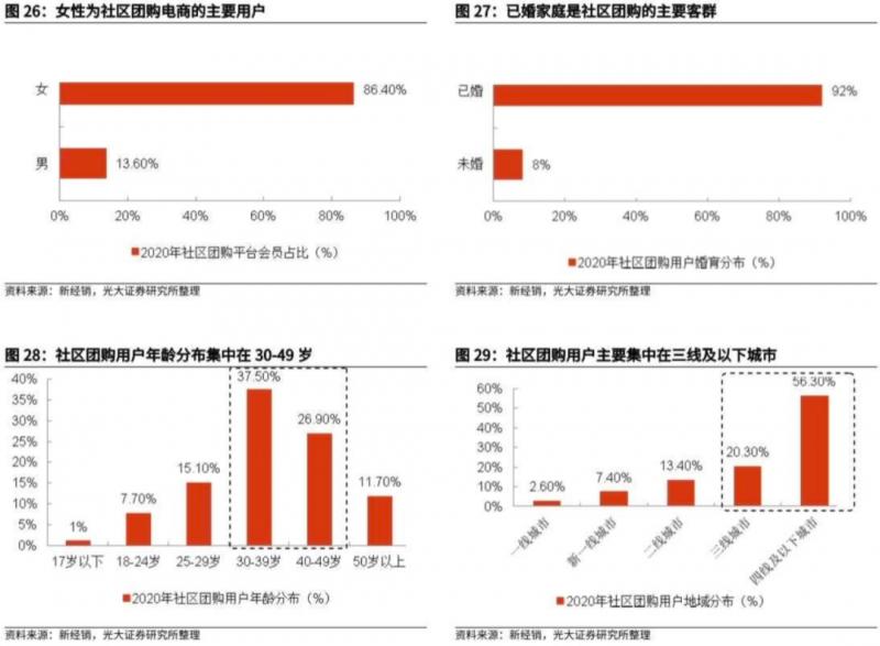 根據(jù)新經(jīng)銷2020年的統(tǒng)計(jì),女性占社區(qū)團(tuán)購平臺(tái)電商的會(huì)員的86%;已婚占社區(qū)團(tuán)購用戶的92%;30-49歲群體占社區(qū)團(tuán)購用戶的64%;下沉城市用戶群體占社區(qū)團(tuán)購用戶的77%,為社區(qū)團(tuán)購的核心用戶。