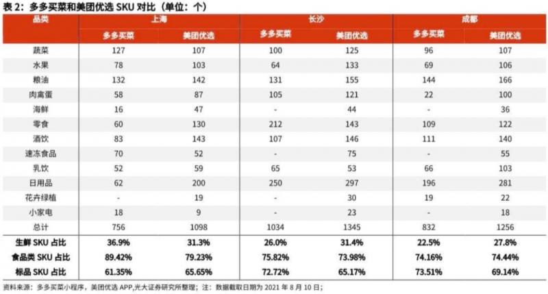 食材類仍是社區(qū)團(tuán)購主要商品。我們統(tǒng)計(jì)了多多買菜和美團(tuán)優(yōu)選在上海、長(zhǎng)沙和成都的SKU分布,截至2021年8月10日,多多買菜的SKU在850個(gè)左右,美團(tuán)優(yōu)選的SKU在1000個(gè)左右。其中:生鮮品類SKU(包括蔬菜、水果、肉禽蛋類和海鮮)占社區(qū)團(tuán)購總SKU約30%;食品類SKU(包括生鮮品類、糧油、零食、酒飲和速凍食品)占社區(qū)團(tuán)購總SKU約75%;標(biāo)品類SKU占社區(qū)團(tuán)購總SKU約70%。對(duì)于同類型商品,社區(qū)團(tuán)購平臺(tái)商品價(jià)格顯著低于前置倉模式下的商品價(jià)格。