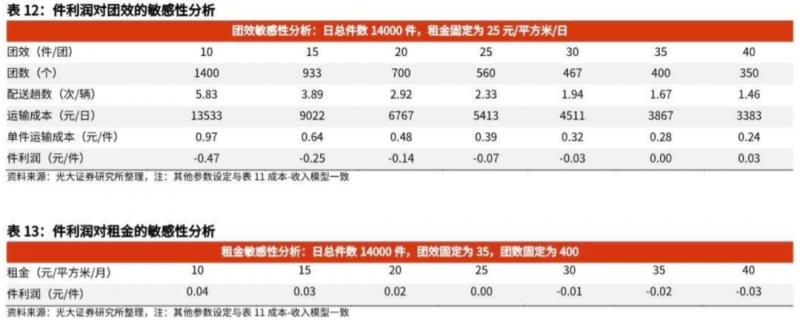 日總件數(shù)恒定情況下,件利潤(rùn)對(duì)團(tuán)效更敏感,對(duì)租金不敏感。仍以日均件數(shù)14000件為例,分別考察件利潤(rùn)對(duì)團(tuán)效和租金的敏感程度。當(dāng)租金恒定為25元/平方米/月時(shí),團(tuán)效由10增至40,件利潤(rùn)變動(dòng)0.5元;當(dāng)團(tuán)效固定為35,團(tuán)數(shù)固定為400,租金由10元/平方米/月增至40元/平方米/月時(shí),件利潤(rùn)變動(dòng)0.07元。件利潤(rùn)對(duì)團(tuán)效的敏感性遠(yuǎn)大于對(duì)租金的敏感性。