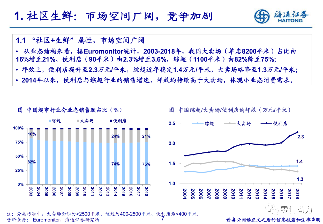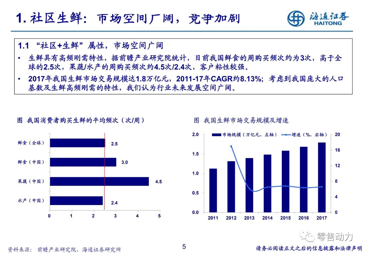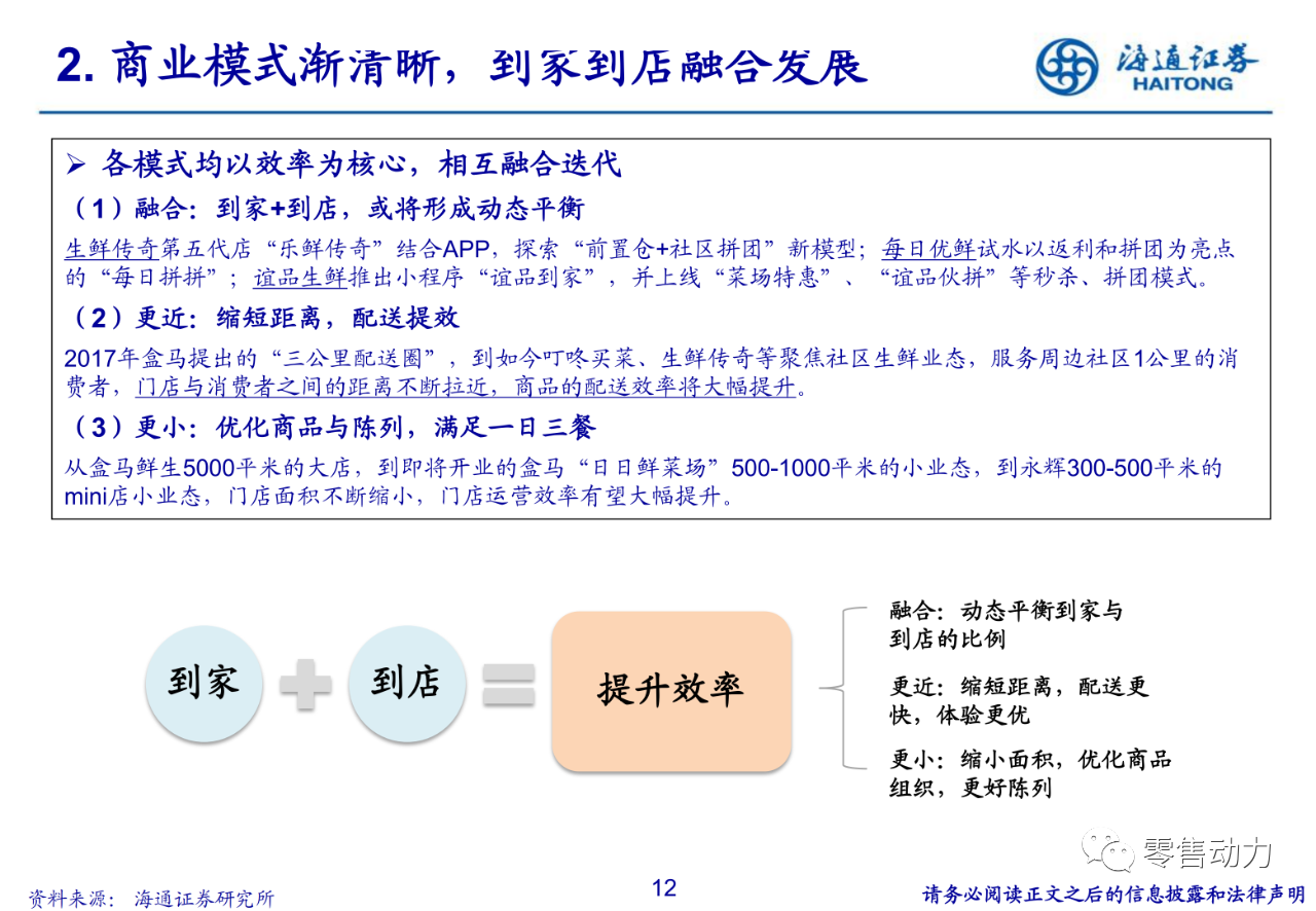 社區生鮮:市場空間廣闊,競爭加劇。隨著零售龍頭及資本方入局,新模式不斷興起,逐漸形成社區生鮮店、前置倉電商、到家到店結合、社區拼團等商業模式,均以效 率為核心(更近更快、更有效的商品組合、更優化的面積與陳列),且各模式之間取長補短、相互融合發展。