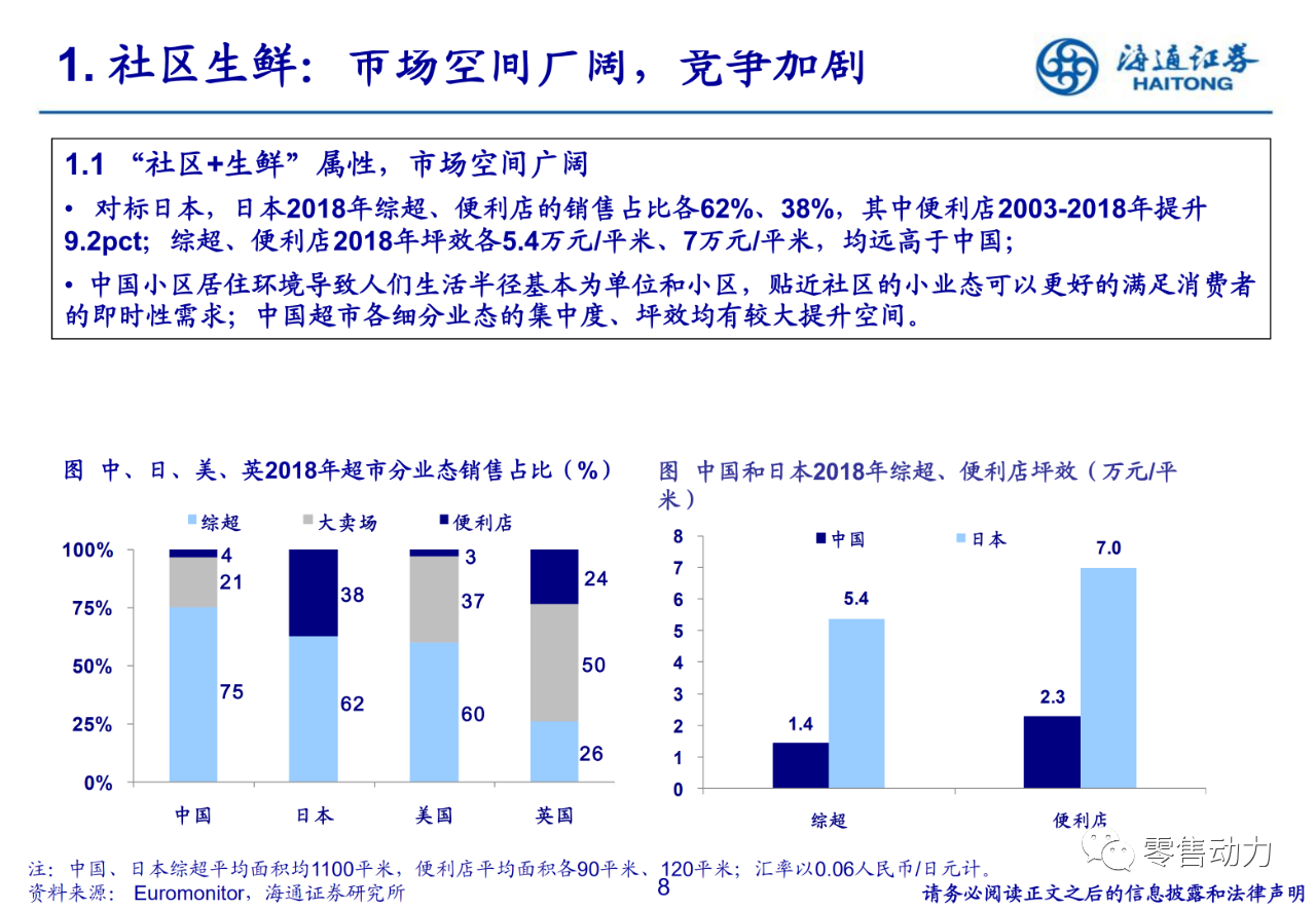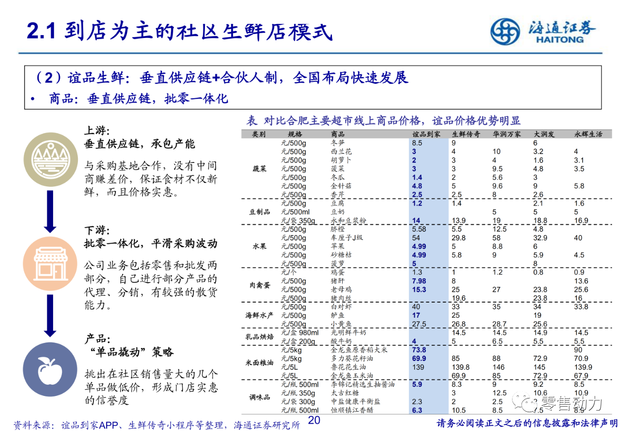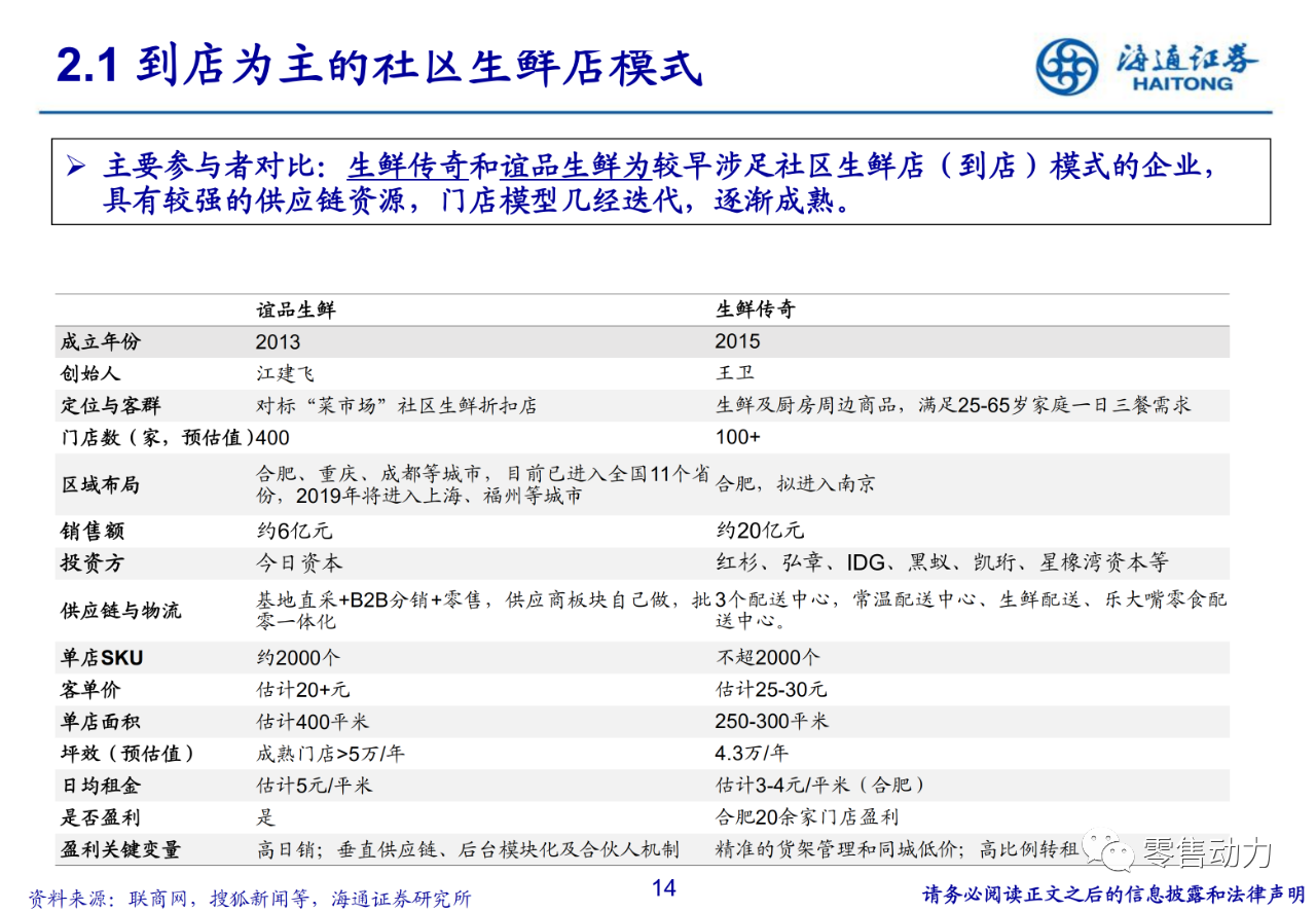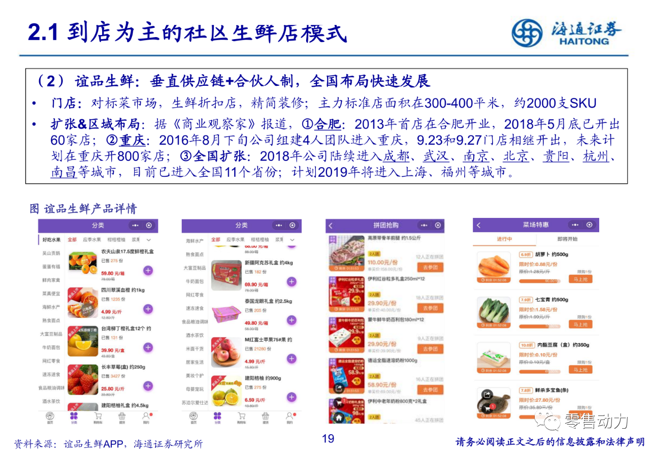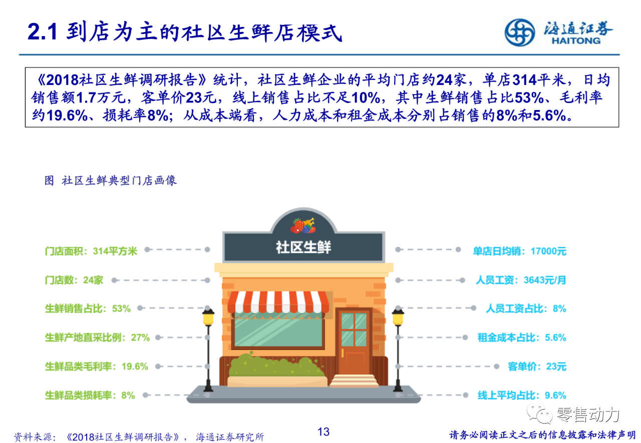 到店為主的社區生鮮店模式。400-500平米社區店,主打生鮮,便捷、低價、優質;但依賴供應鏈與品牌效應, 跨區域難度較大。