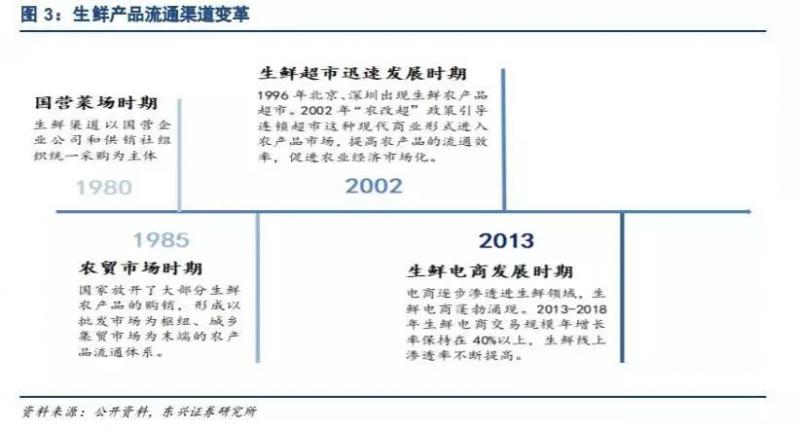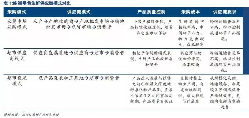 1996年在北京、深圳等地開始出現(xiàn)生鮮農(nóng)產(chǎn)品超市零售,但產(chǎn)品數(shù)量較少,品種有限且價格偏高,農(nóng)產(chǎn)品批發(fā)市場或農(nóng)貿(mào)市場仍是生鮮主要采購渠道。2002年,政府推出的農(nóng)貿(mào)市場超市化。2008年政府開始部署“農(nóng)超對接”模式試點(diǎn),超市與供應(yīng)基地對接,開始解決生鮮供應(yīng)與配送問題,價格與農(nóng)貿(mào)市場差距逐漸縮小。