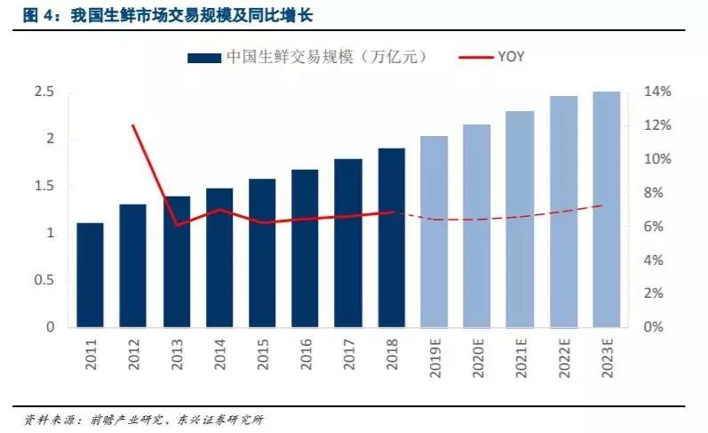 生鮮市場體量巨大,增速穩(wěn)定。據(jù)中國產(chǎn)業(yè)信息網(wǎng),2018年我國生鮮市場交易額為1.91萬億元,同比增長6.6%。生鮮作為我國家庭日常的必須消費(fèi),交易具有一定的確定性,在我國龐大的人口基數(shù)支撐下,生鮮市場有望保持6%左右的增長。