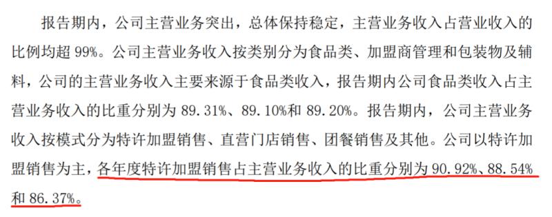 據巴比食品上市公告書,報告期內,公司主營業務收入按模式分為特許加盟銷售、直營門店銷售、團餐銷售及其他。公司以特許加盟銷售為主,2017~2019年特許加盟銷售占主營業務收入的比重分別為90.92%、88.54%和86.37%。