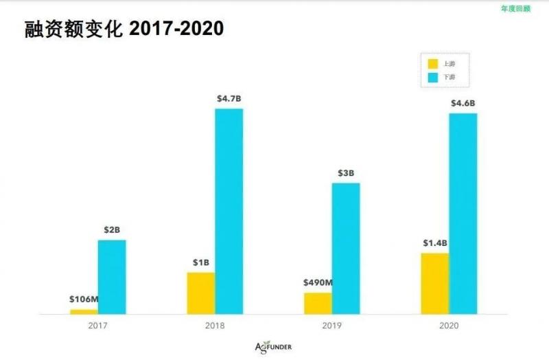 參照全球的創投市場,Ginkgo Bioworks、Benson Hill等農業食品科技公司在2021年收獲了多個IPO碩果,其中作物基因設計公司Benson Hill,2020年獲得了谷歌風投的持續加注獲得1.6億美元D輪融資,2021年5月10日該公司將通過SPAC上市,這為中國的農業科技創投市場提供了多樣化退出的參考模板。根據AgFunder的統計,2020年全球食品農業領域的投融資金額整體增長34.5%,而上游農業科技的投資金額體量自2014年至今6年來首次反超了下游,可見中國的上游科技投資潛力巨大。