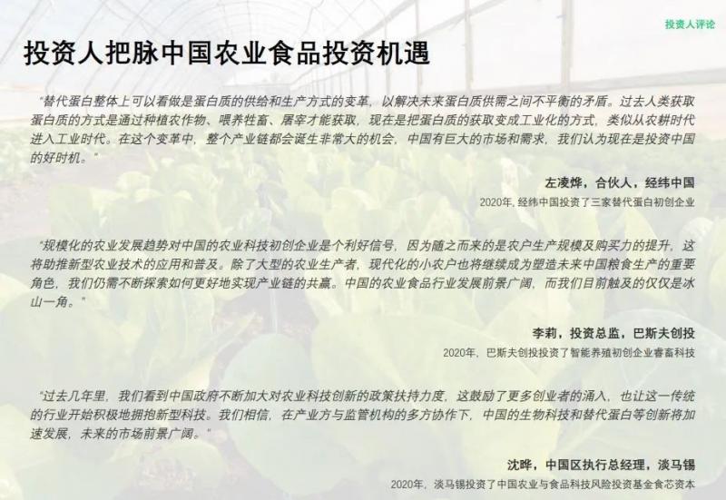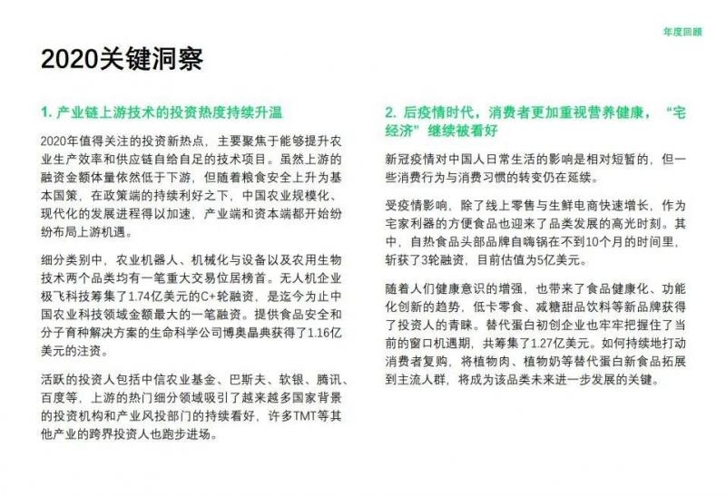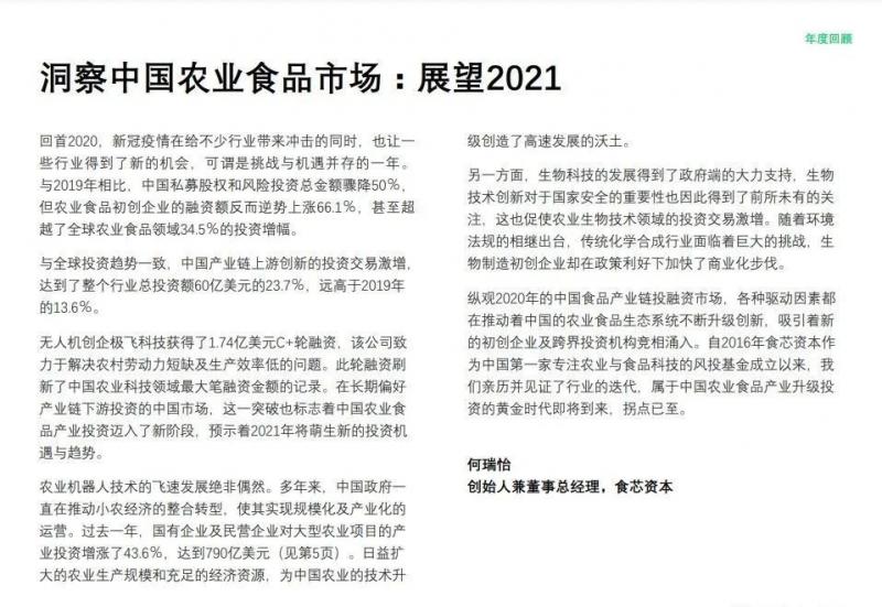 食芯資本的創始人兼董事總經理何瑞怡總結道:“縱觀2020年的中國農業和食品行業投融資市場,越來越多的頂尖科學家及一線投資機構正在涌入,科技賦能農業創新是大勢所趨。我們會繼續順勢而為、挖掘優質的初創企業,以投資+科技的創新模式,和大家一起加速構建一個更可持續發展、更堅韌的食品供應鏈。”