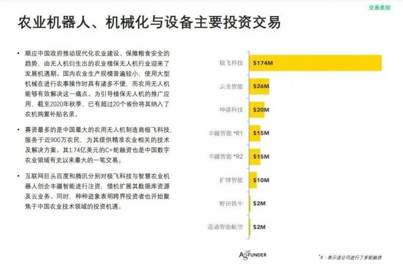 在農業機器人板塊,2020年農業無人機企業極飛科技斬獲1.74億美元C+輪融資,創下了迄今為止中國農業科技領域最大的一筆融資,其投資方包括創新工場、百度資本、軟銀愿景基金等TMT領域的跨界投資人。2021年3月,極飛更是宣布完成由高瓴追加投資超3億元人民幣的C++輪融資。科技創企豐疆智能也獲得了騰訊領投的數億元人民幣A輪融資。