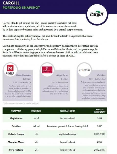 不過,通常情況下,大多數企業風投部門都不會涌入同一投資交易。嘉吉是創新食品類別的最大投資者,特別是蛋白質替代品。它的風險投資包括細胞培養肉類公司Aleph Farm,Upside Foods(前Memphis Meats),還有植物蛋白制造商Puris。