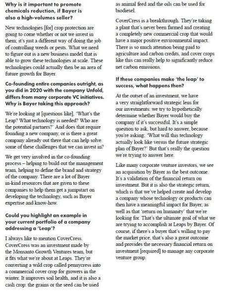 2018年拜耳完成對孟山都的收購時,Leaps by Bayer也收購了孟山都Growth Ventures在CoverCress的股份。自那以后,拜耳對這家初創公司進行了后續投資。