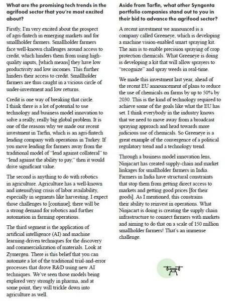 先正達風險投資Syngenta Ventures對研究RNA的初創公司Greenlight Biosciences和專注于通過生物手段改善作物氣候適應性的Sound Agriculture的支持也值得注意。