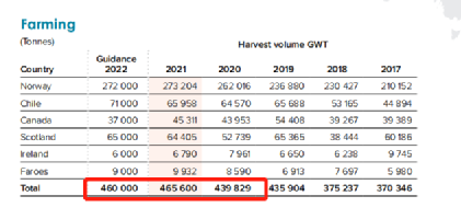 但供給端的情況卻顯得差強(qiáng)人意。據(jù)統(tǒng)計(jì),過(guò)去10年中,三文魚全球產(chǎn)量復(fù)合增長(zhǎng)率為6%,預(yù)期未來(lái)將下降至4%。全球最大的三文魚供應(yīng)商美威(Mowi)2021年年報(bào)數(shù)據(jù)顯示,報(bào)告期內(nèi)三文魚供應(yīng)量為465,600噸,同比增速為5.86%,2022年的供給量將減少至460,000噸,同比下降1.2%。