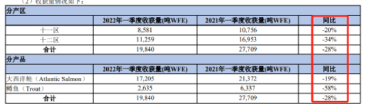 2019年作價(jià)9.2億美元收購(gòu)收購(gòu)三文魚業(yè)務(wù)核心資產(chǎn)AustralisSeafoodsS.A.(簡(jiǎn)稱:A.S.公司)99.84%的股權(quán),上演蛇吞象式并購(gòu)。此舉雖然成功切入產(chǎn)業(yè)鏈的高價(jià)值環(huán)節(jié),依托牌照資質(zhì)等稀缺資源建立領(lǐng)先企業(yè)護(hù)城河,成為國(guó)內(nèi)唯一一家覆蓋三文魚養(yǎng)殖、進(jìn)口、加工銷售的全產(chǎn)業(yè)鏈公司。但在三文魚市場(chǎng)保持較好預(yù)期的前提下,公司魚產(chǎn)量卻開(kāi)始出現(xiàn)下跌的苗頭。2021年Australis總收獲量為8.43萬(wàn)噸,同比下降22.08%;2022年一季度,Australis總收獲量依然沒(méi)有上漲的趨勢(shì),收獲量為1.98萬(wàn)噸,同比降28%,其中,大西洋鮭收獲量為17,205噸(WFE),同比減少19%,鱒魚收獲量為2,635噸,同比減少58%。