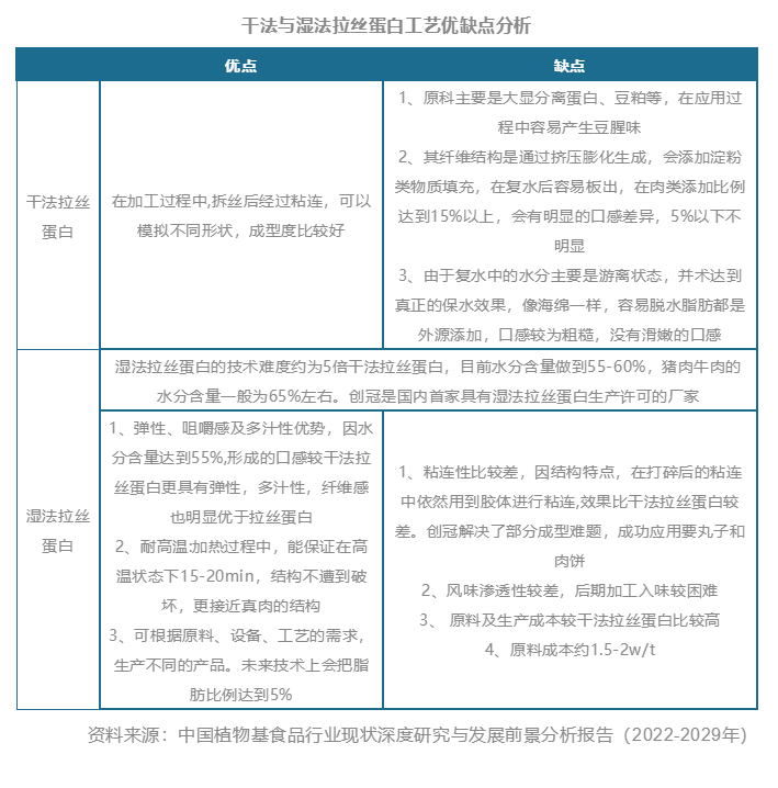 比如:植物肉必須用到的拉絲蛋白技術(shù)。歐美等國(guó)家采用濕法拉絲蛋白技術(shù),我國(guó)多數(shù)企業(yè)采用干法拉絲技術(shù),這兩種技術(shù)生產(chǎn)出的肉感有云泥之別,就好比烏冬面和方便面,前者Q彈有嚼勁,后者在彈性方面有較大差距。同時(shí)濕法拉絲蛋白會(huì)更好做成肉塊、肉餅有更好的食用體驗(yàn),而國(guó)內(nèi)目前大多只能做成肉末的形態(tài)。