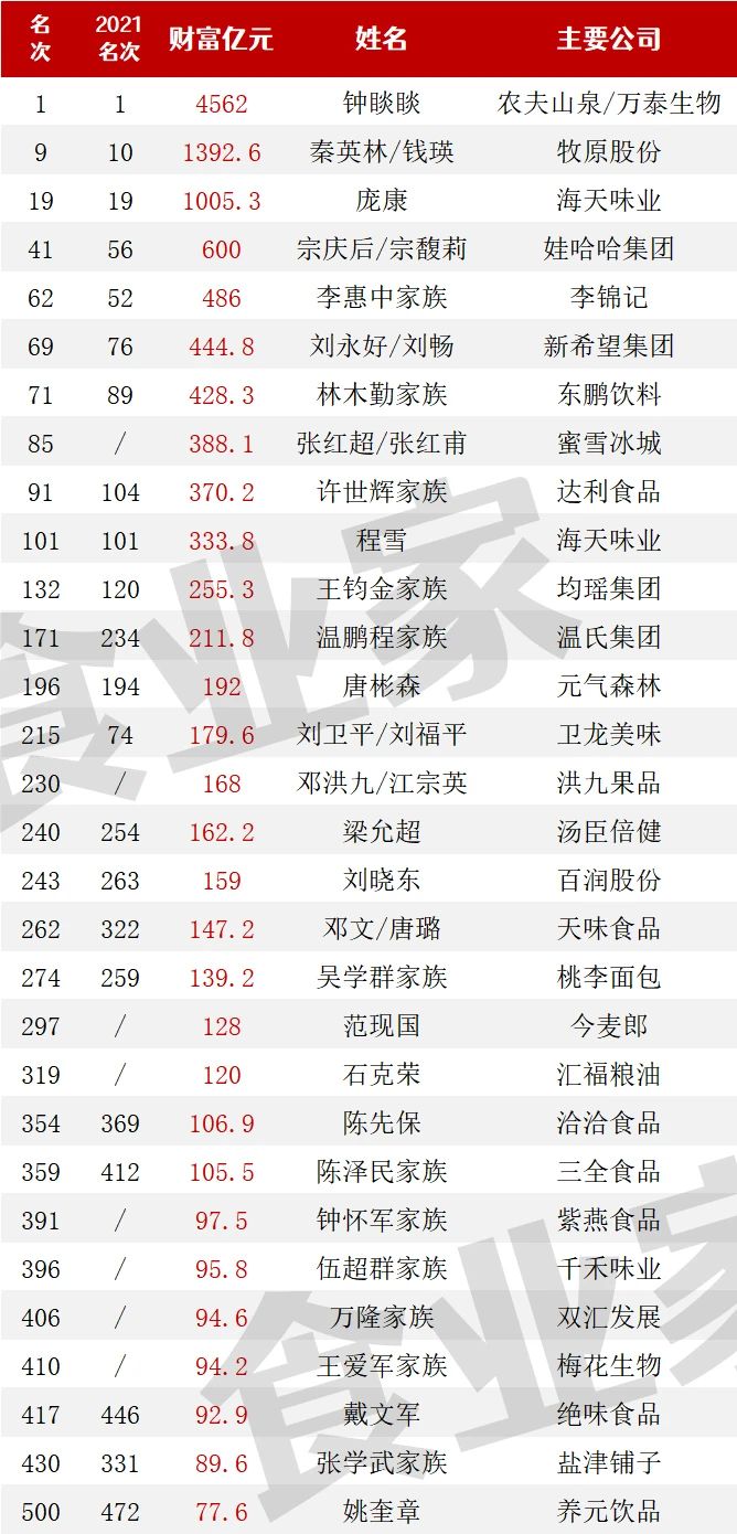 同在消費品領域,蜜雪冰城張紅超/張紅甫兄弟、洪九果品鄧洪九/江宗英夫婦、今麥郎范現國、匯福糧油石克榮、紫燕食品鐘懷軍家族、千禾味業伍超群家族、雙匯發展萬隆家族、梅花生物王愛軍家族等也首次上榜。