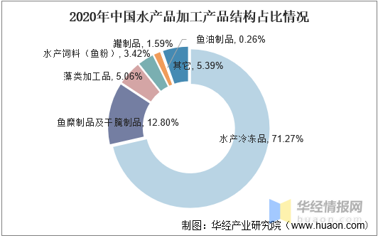 2020年我國水產品加工產品中,水產冷凍品為1475.91萬噸,占總量的71.27%;魚糜制品及干腌制品為265.09萬噸,占總量的12.8%;藻類加工品為104.81萬噸,占總量的5.06%。