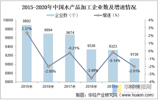 2015-2020年中國水產品加工企業數及增速情況