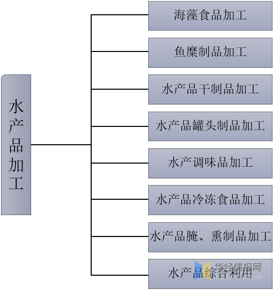 水產品加工業是水產品行業的組成部分,是一種以水產捕撈和養殖的產品為原料,進行保鮮、貯藏或加工成各種形式的食品或其他產品的生產部門,產品主要有魚、蝦、蟹、貝、藻類等經濟水產動植物的冷凍、冰鮮、腌制、熏制、干制、罐裝和熟食品等水產食品。