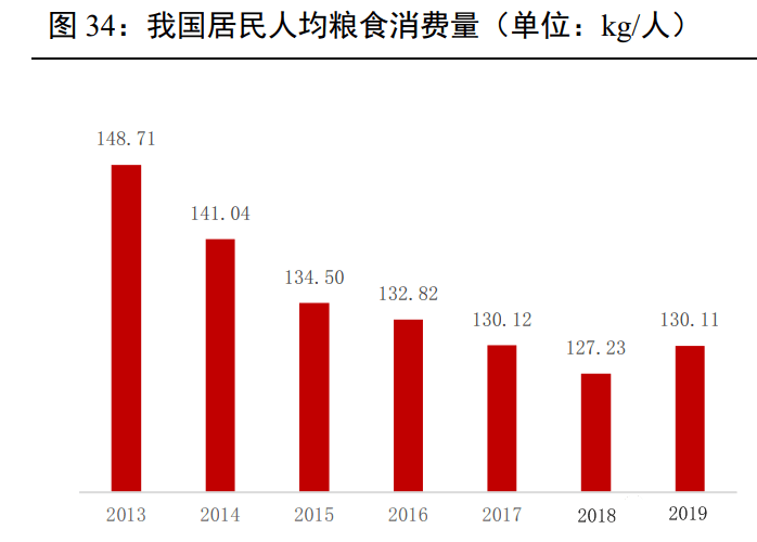 2013-2020 年我國居民人均糧食消費量持續下降,而肉類人均消費量持續上升。2019年因為非洲豬瘟影響生豬供應量大幅下降,我國居民人均肉類消費量下降至 26.9kg/人,與此同時人均糧食消費量上升至130kg/人。
