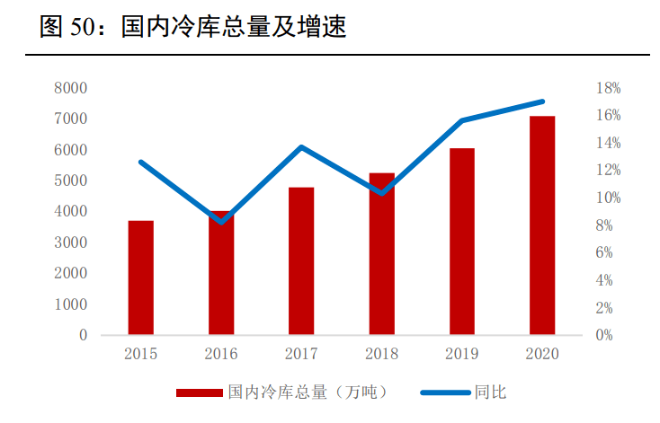 2015-2020年我國冷庫總量呈逐年遞增趨勢,2020年全國冷庫總量達7080萬噸,新增庫容1025萬噸,同比增長17%。在專業物流企業帶動下,低溫保鮮技術、車輛設計制造技術、信息化物流配送技術的進一步發展,新技術運用使冷鏈配送成本大幅降低。