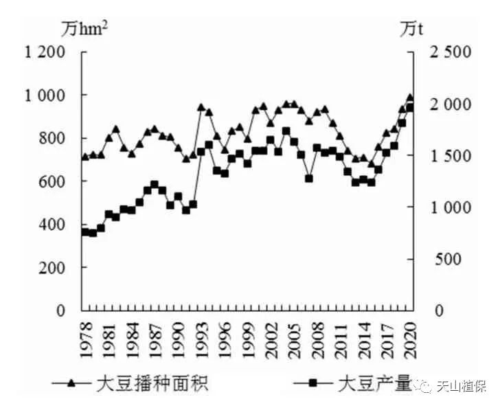 圖1 1978—2020年大豆播種面積和產量變化趨勢