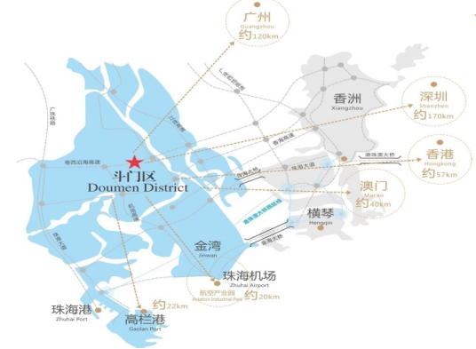 區位優勢:珠海市位于中國經濟最活躍的珠三角州區域,是珠江西岸核心城市。南與澳門相連,東眺香港。擁有全國最大的陸路口岸和24小時便利通關,在粵港澳區域中具有重要戰略地位。以斗門為中心,2小時車程內各種產業配套齊全,產品可在1小時內通過香港、澳門發往世界各地,斗門全面融入粵港澳大灣區。