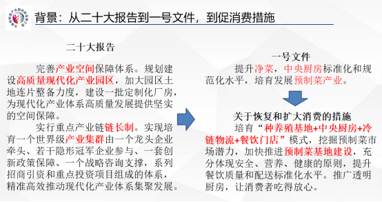 二十大報告里提出的鏈長制就勾勒一副產業發展的國際化藍圖。到了一號文件馬上解釋并定性預制菜為產業。再到國家發改委促銷費的措施里,明確了四位一體的產業模型。為一號文件指明了方向。