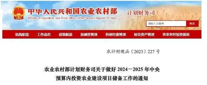 日前,農(nóng)業(yè)農(nóng)村部計(jì)劃財(cái)務(wù)司發(fā)布了《關(guān)于做好2024-2025年中央預(yù)算內(nèi)投資農(nóng)業(yè)建設(shè)項(xiàng)目?jī)?chǔ)備工作的通知》,要求按照“大穩(wěn)定、小調(diào)整” 的原則,提早做好2024-2025年中央預(yù)算內(nèi)投資項(xiàng)目的前期儲(chǔ)備工作,涉及高標(biāo)準(zhǔn)農(nóng)田建設(shè),畜禽糞污資源化利用,現(xiàn)代種業(yè)提升工程,農(nóng)業(yè)科技創(chuàng)新等項(xiàng)目;